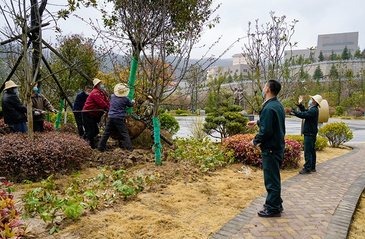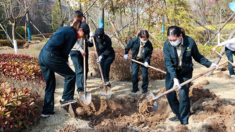 植樹活動現場,大家在做好疫情自我防護的同時,干勁十足。他們三五人自發成組,相互配合、默契協作,或扶樹填坑、或揮鍬培土、或提桶澆水,每個環節銜接有序,合力栽下一棵棵樹苗,也共同播下疫散春來、華枝春滿的勃勃生機。經過幾個小時的努力,一株株新栽種的冬青、石楠、廣玉蘭、雪松等樹木迎風而立,為金徽股份增添了一片片濃濃春意。